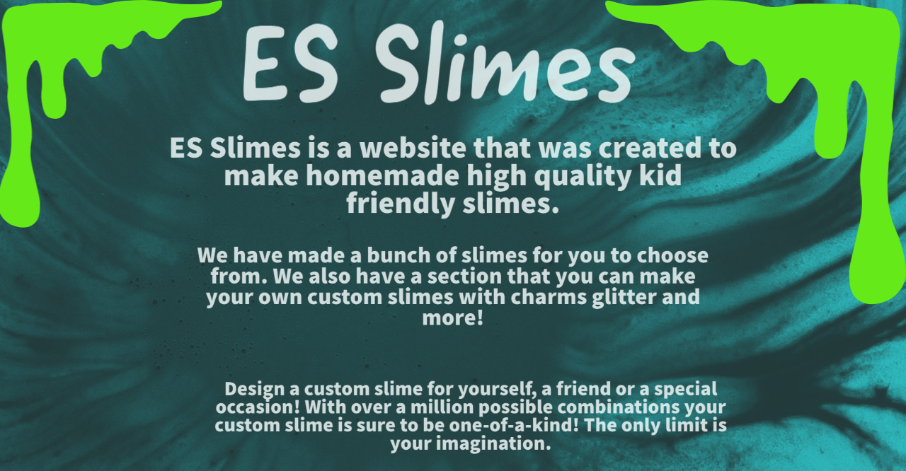 ES Slimes produces home-made kid friendly slime. We can make custom orders and can accommodate special events like birthdays and holidays. Purchasers can purchase addon like glitter, pompoms and more.
